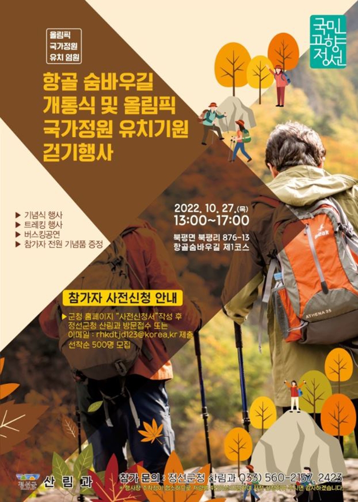 | ▲ 항골 숨바우길 개통식 및 올림픽 국가 정원 유치 기원 걷기 포스터 [정선군 제공.재판매 및 DB 금지] |