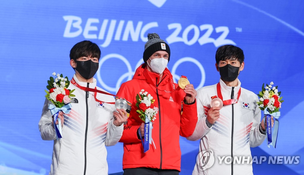 | ▲  South Korean silver medalist Chung Jae-won (L) and bronze medalist Lee Seung-hoon (R) flank the champion, Bart Swings of Belgium, during the memdal ceremony for the men's mass start speed skating race at the Beijing Winter Olympics at Beijing Medal Plaza in Beijing on Feb. 19, 2022. (Yonhap) |
