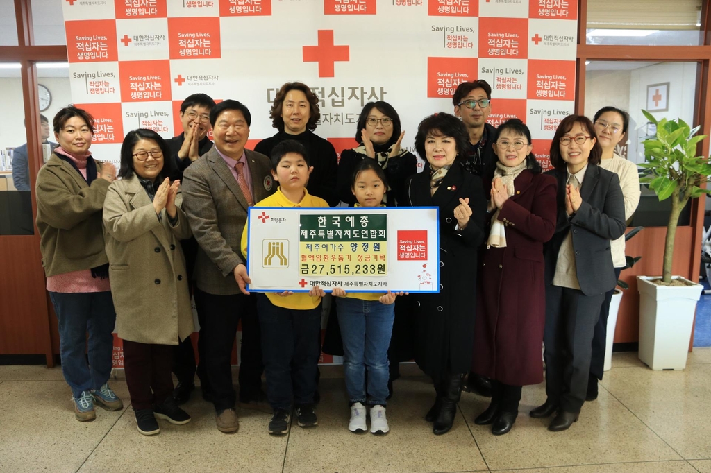 (제주=연합뉴스) 전지혜 기자 = 한국예술문화단체총연합회 제주도연합회(이하 제주예총)는30일 대한적십자사 제주도지사를 찾아 혈액암 투병 중인 제주어 가수 양정원씨를 돕기 위해 모금한 2천751만5천233원을 전달했다고 31일 밝혔다.