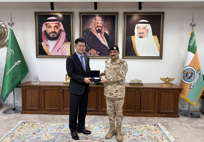 Seok Jong-gun (L), minister of South Korea's Defense Acquisition Program Administration, and Saleh bin Abdulrahman Al-Harbi, chief of staff of the Saudi Arabian National Guard, pose for a photo during their talks in Saudi Arabia on May 13, 2025, in this photo released by the state arms procurement agency. (PHOTO NOT FOR SALE) (Yonhap)