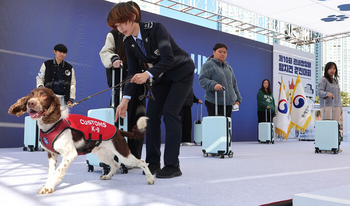 Woo Ji-yeon, a canine handler, and Phantom, a drug-sniffing dog, demonstrate how to sniff for drugs during a sniffing skill competition of the Korea Customs Service Commissioner Cup at a park in Incheon, west of Seoul, on Nov. 14, 2025. (Yonhap)