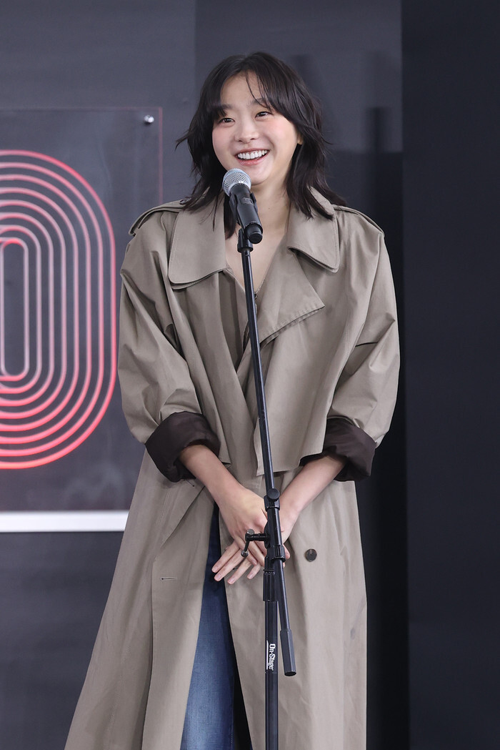South Korean actress Kim Da-mi, who stars in the new netflix movie "The Great Flood," speaks during an event to promote the film at the 30th Busan International Film Festival in the southeastern port city of Busan on Sept. 19, 2025. (Yonhap)