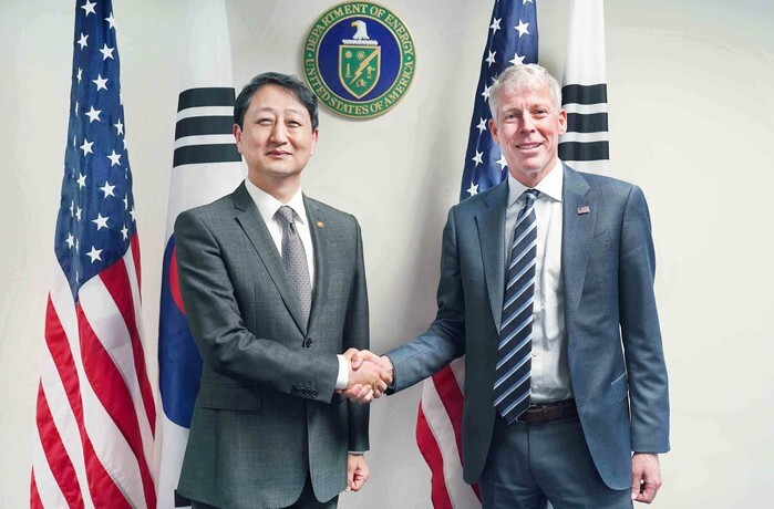 South Korean Industry Minister Ahn Duk-geun (L) poses for a photo with U.S. Secretary of Energy Chris Wright during their meeting in Washington on March 20, 2025, in this photo released by the South Korean ministry. Ahn and Wright agreed to cooperate to "swiftly" resolve the issue of Seoul being designated a "sensitive" country by the U.S. Department of Energy, according to the ministry. (PHOTO NOT FOR SALE) (Yonhap)