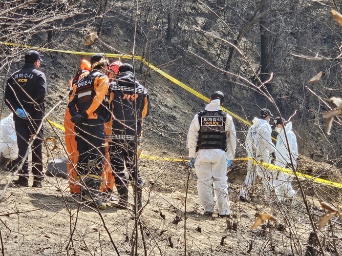 Investigators examine a location on a mountainous area in Uiseong, North Gyeongsang Province, southeastern South Korea, on March 31, 2025, where a massive wildfire allegedly started. Firefighting authorities have said a visitor caused the disaster after setting fire to waste while conducting a memorial service near a family tomb in the location. (Yonhap)