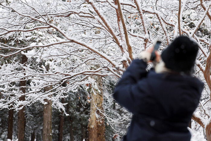 A citizen takes a photo of snow on trees at Chonnam National University in Gwangju, some 270 kilometers southwest of Seoul, on Dec. 28, 2024, when a snow alert was issued for the city. (Yonhap)