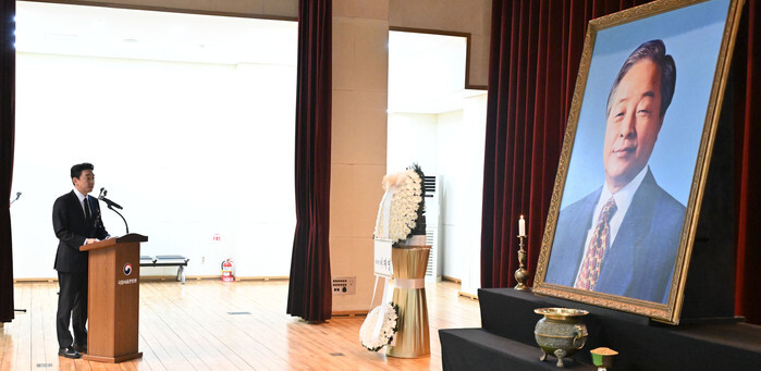 Presidential chief of staff Kang Hoon-sik reads a eulogy on behalf of President Lee Jae Myung in front of a portrait of former President Kim Young-sam during a memorial marking the 10th anniversary of his death at the National Cemetery in Seoul on Nov. 21, 2025. (Pool photo) (Yonhap)