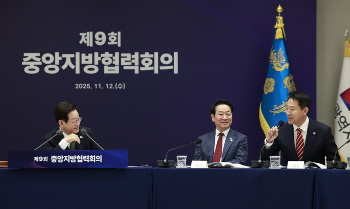 President Lee Jae Myung (L) listens to Seoul Mayor Oh Se-hoon (R) during a meeting at the presidential office in Seoul on Nov. 12, 2025, to enhance cooperation between the central government and local governments. (Pool photo) (Yonhap)