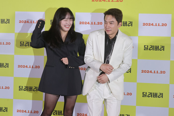 South Korean actor Kim Young-min and actress Kwon So-hyun, who star in the new movie "Delivery," pose for a photo during an event in Seoul on Nov. 11, 2024, to promote the movie, set to hit local screens in South Korea on Nov. 20. (Yonhap)