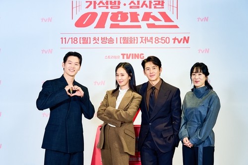 This photo, provided by tvN on Nov. 11, 2024, shows South Korean actresses Kwon Yoo-ri (2nd from L), Baek Ji-won (R) and actor Lee Hak-joo (L) and Ko Soo (2nd from R), who star in the tvN drama "Parole Examiner Lee." The first episode of the drama will be aired on local cable TV network tvN on Nov. 18. (PHOTO NOT FOR SALE) (Yonhap)
