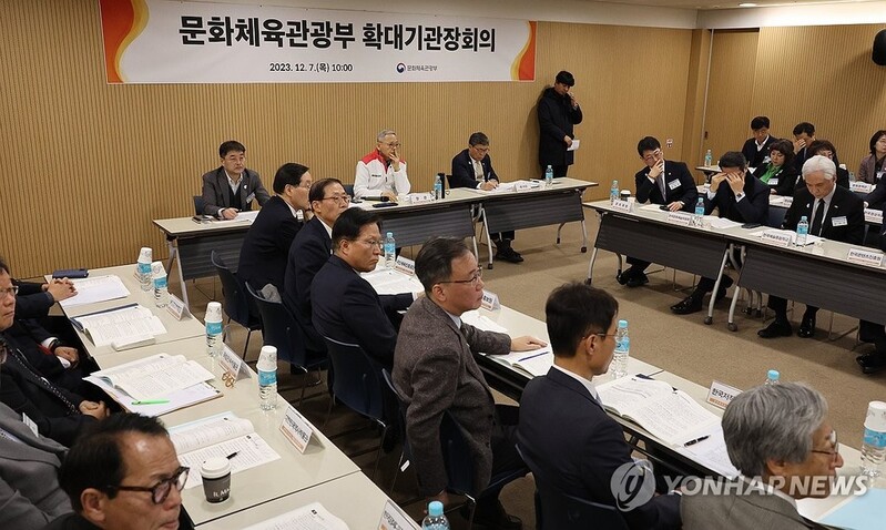 | ▲ 문화체육관광부 확대기관장회의 (세종=연합뉴스) 최재구 기자 = 유인촌 장관이 참석한 가운데 7일 세종시 국립세종도서관에서 문화체육관광부 확대기관장회의가 열리고 있다. 2023.12.7 jjaeck9@yna.co.kr |