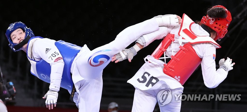 | ▲ Lee Da-bin of South Korea (L) fights Milica Mandic of Serbia in the final of the women's +67kg taekwondo event at Makuhari Messe Hall A in Chiba, Japan, on July 27, 2021. (Yonhap) |