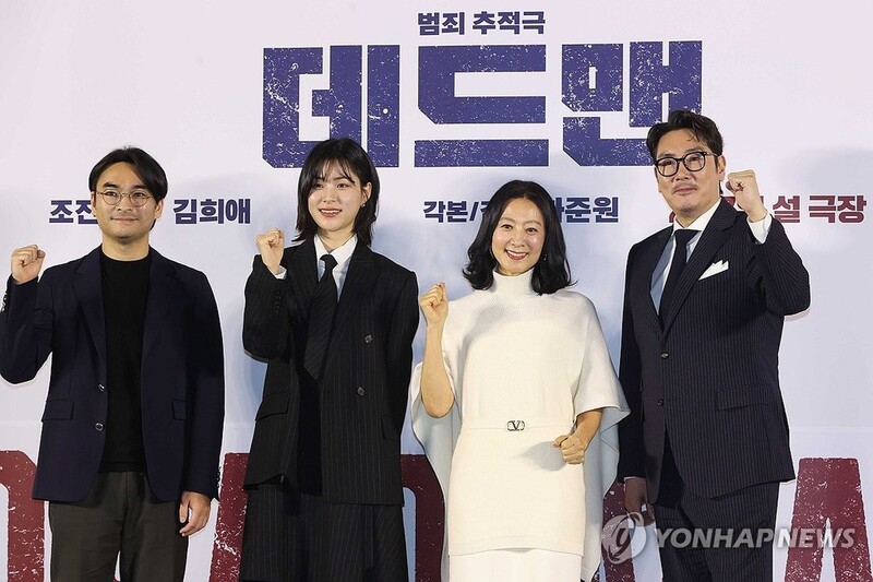 | ▲ 영화 '데드맨' 제작보고회 (서울=연합뉴스) 강민지 기자 = 19일 서울 성동구 메가박스 성수에서 열린 영화 '데드맨' 제작보고회에서 감독과 배우들이 포즈를 취하고 있다. 왼쪽부터 하준원 감독, 이수경, 김희애, 조진웅. 2024.1.19 mjkang@yna.co.kr |