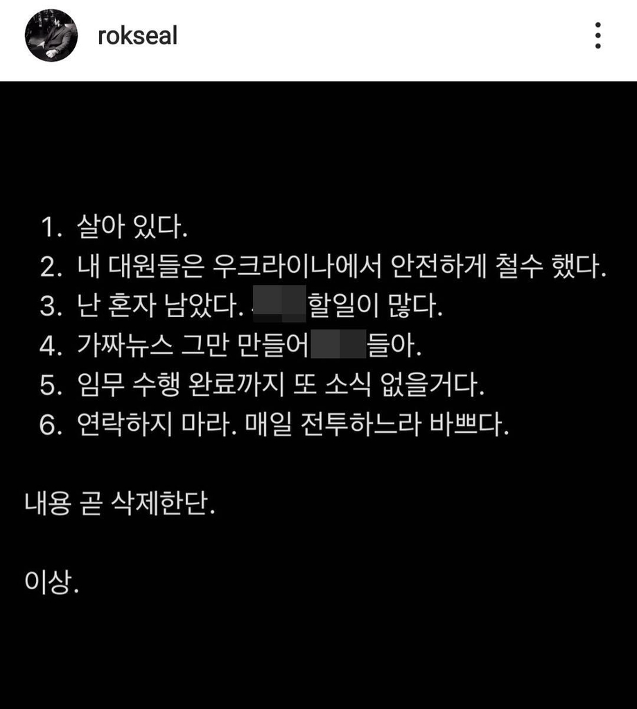 (서울=연합뉴스) 강애란 기자 = 우크라이나 의용군으로 참여하겠다며 현지로 떠난 해군특수전전단(UDT/SEAL) 대위 출신 이근 씨가 사회관계망서비스(SNS)에 생존 소식을 올렸다.