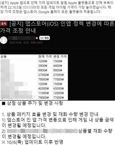 | ▲ 중소 게임업체들의 애플 인앱 결제 가격 인상에 따른 가격 변동 공지 [온라인 커뮤니티 캡처] |