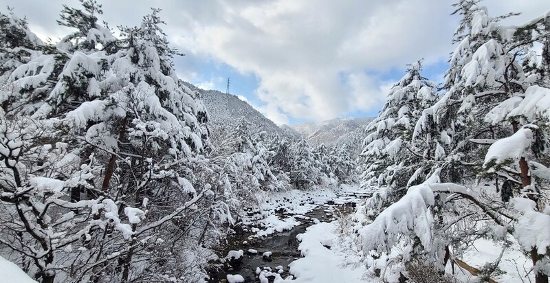 올라간 기온에 눈이 녹으면서 무게를 감당하지 못하고 나뭇가지에서 가끔 떨어지는 눈에 깜짝 놀라 산 쪽을 올려다보면 눈 덮인 숲이 한폭의 산수화를 연상케 한다.
