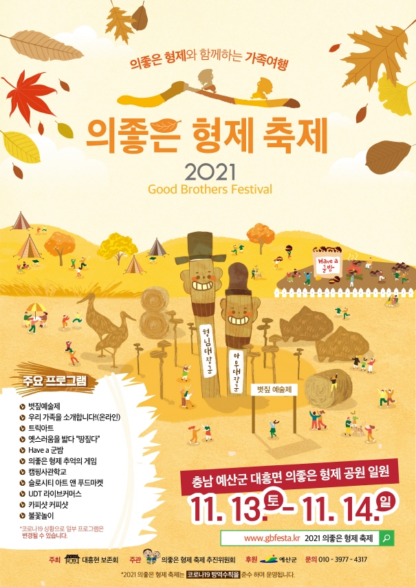 (예산=연합뉴스) 정찬욱 기자 = 충남 예산군은 오는 13∼14일 대흥면 의좋은 형제 공원 일원에서 '2021 의좋은 형제 축제'를 개최한다.