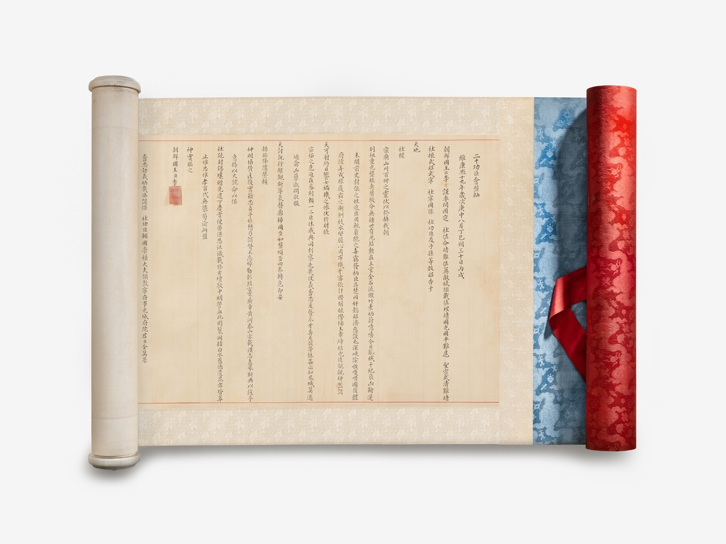 '이십공신회맹축-보사공신녹훈후'는 숙종이 1694년 세자와 왕자, 신구 공신과 자손을 모아 단결을 맹세하는 의례인 회맹제를 치른 뒤 만들었다. 비단, 상아, 옥을 사용해 호화롭고 완성도가 높아 미술사적으로도 가치가 있다.