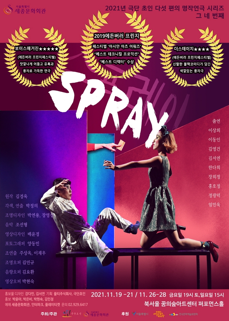 ▲ 극단 초인 연극 '스프레이' '우리 엄마는 선녀였다' = 극단 초인이 오는 19일부터 12월 5일까지 연극 '스프레이'와 '우리 엄마는 선녀였다'를 차례로 선보인다.