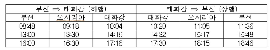 하행열차는 부전역에서 오전 8시 48분, 오후 1시, 4시 태화강역으로 출발하며 상행열차는 태화강역에서 오전 10시 20분, 오후 2시 32분, 5시 30분에 부전역으로 출발한다.