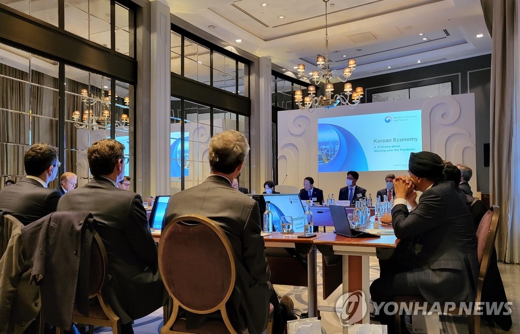 | ▲ Finance Minister Hong Nam-ki holds an investor relations session in London to explain South Korea's economic situations on Nov. 1, 2021. (Yonhap) |