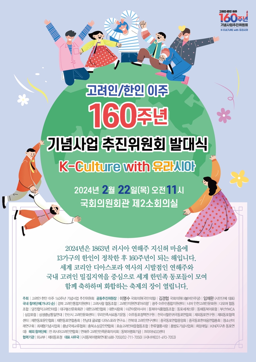 동북아 지역 동포 지원단체인 사단법인 동북아평화연대(동평·이사장 김현동)는 오는 22일 오전 11시 서울 영등포구 국회의원회관 제2소회의실에서 '고려인/한인 이주 160주년 기념사업 추진위원회' 발대식을 개최한다고 20일 밝혔다.