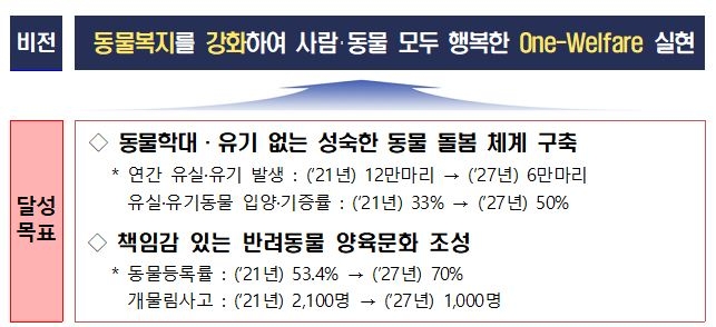 농림축산식품부는 6일 발표한 '동물복지 강화 방안'에서 지난해 12만 마리에 달한 국내 유실·유기 동물 수를 오는 2027년 6만 마리로 절반 수준으로 줄이겠다고 밝혔다.