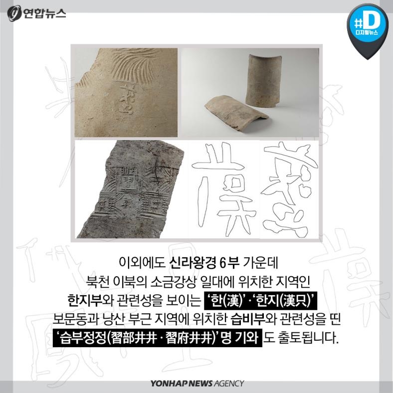 이외에도 신라왕경 6부 가운데 북천 이북의 소금강상 일대에 위치한 지역인 한지부와 관련성을 보이는 '한(漢)'ㆍ'한지(漢只)', 보문동과 낭산 부근 지역에 위치한 습비부와 관련성을 띤 '습부정정(習部井井ㆍ習府井井)' 명 기와도 출토됩니다.