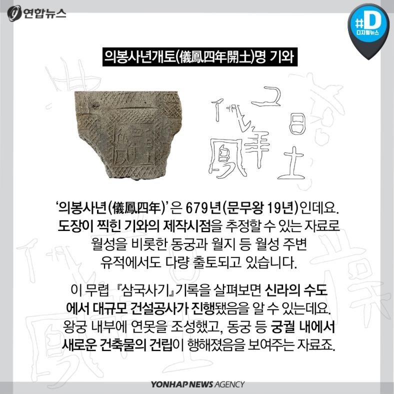 의봉사년(儀鳳四年)은 679년(문무왕 19년)인데요. 도장이 찍힌 기와의 제작시점을 추정할 수 있는 자료로 월성을 비롯한 동궁과 월지 등 월성 주변 유적에서도 다량 출토되고 있습니다.