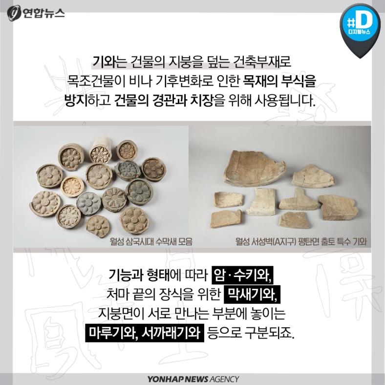 기능과 형태에 따라 암·수키와, 처마 끝의 장식을 위한 막새기와, 지붕면이 서로 만나는 부분에 놓이는 마루기와, 서까래기와 등으로 구분되죠.