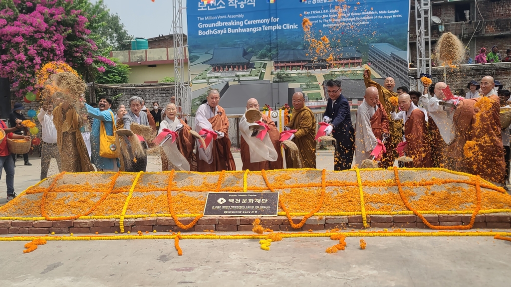 | ▲ 인도 분황사 보건소 착공식 (부다가야<인도>=연합뉴스) 양정우 기자 = 21일 인도 부다가야에서는 첫 한국 전통사찰인 분황사 대웅보전 준공식에 이어 보건소 착공식이 봉행됐다. 2022.5.21 eddie@yna.co.kr |