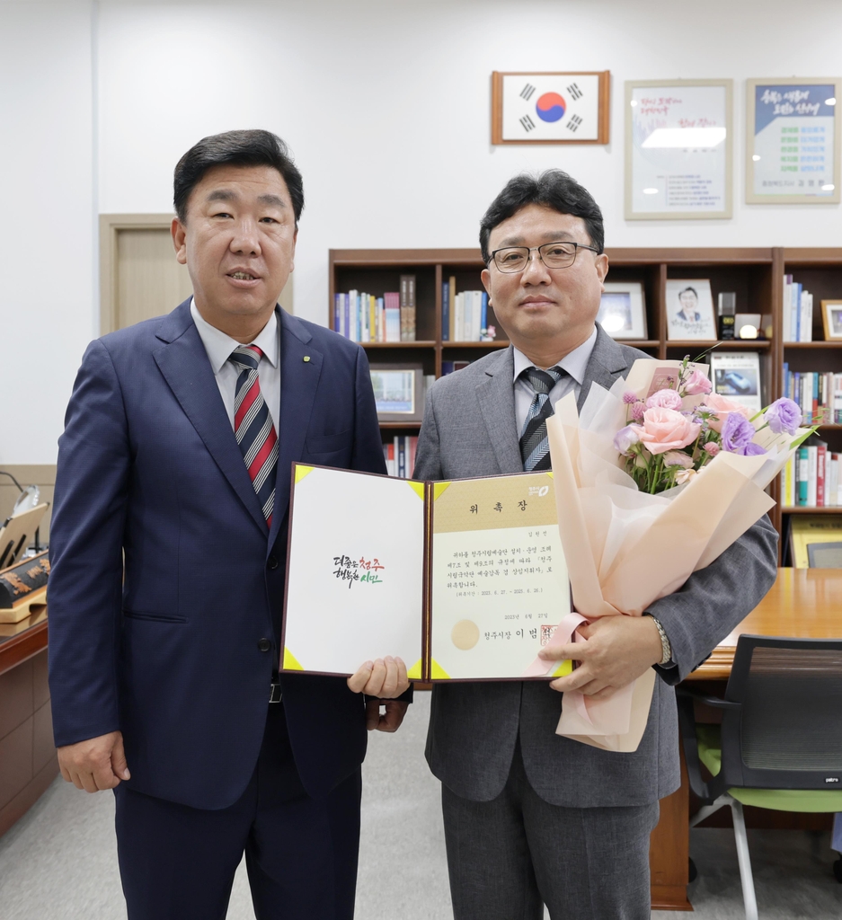(청주=연합뉴스) 박재천 기자 = 이범석 청주시장은 27일 김원선 청주시립국악단 제14대 예술감독 겸 상임지휘자에게 위촉장을 전달했다.