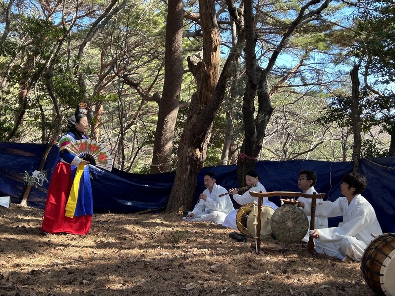 17일 오후 당산(堂山·수호신이 있다고 여겨 신성시하는 마을 근처의 산이나 언덕)에서 열린 당산굿에서는 마을 이장을 비롯한 주민, 행사 관계자 30여 명만 참석했다.