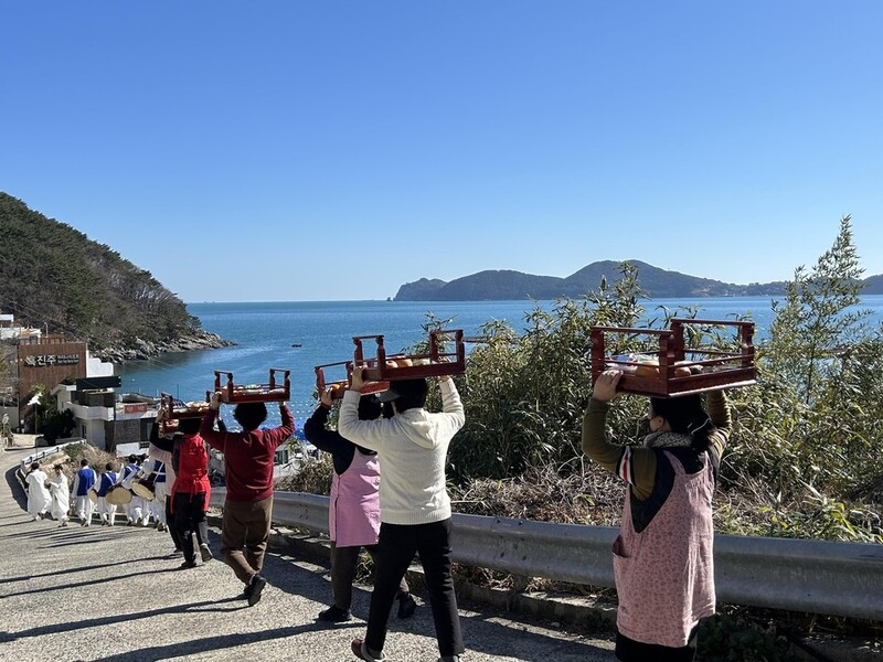 | ▲ 굿에 올리기 위한 음식 (거제=연합뉴스) 김예나 기자 = 지난 17일 경남 거제시 동부면 수산마을 일대에서 열리는 '거제수산별신굿' 행사를 위해 마을 주민들이 음식을 나르고 있다. 2024.2.19 yes@yna.co.kr |