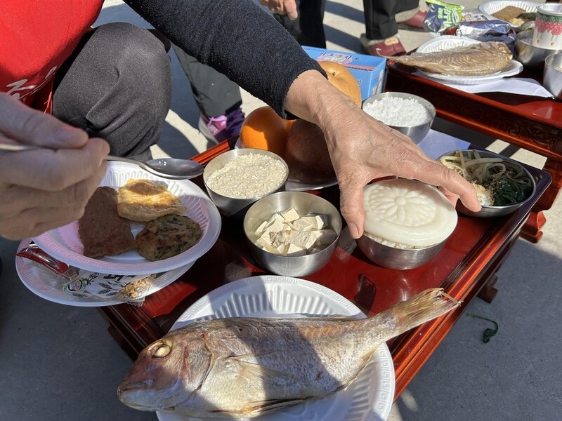바다 앞에는 마을 사람들이 정성껏 준비한 음식이 상에 올려져 있었다. 주민들은 굿 돈을 건네고 올해 무탈하게 잘 지낼 수 있도록 도와달라고 간절히 바랐다.