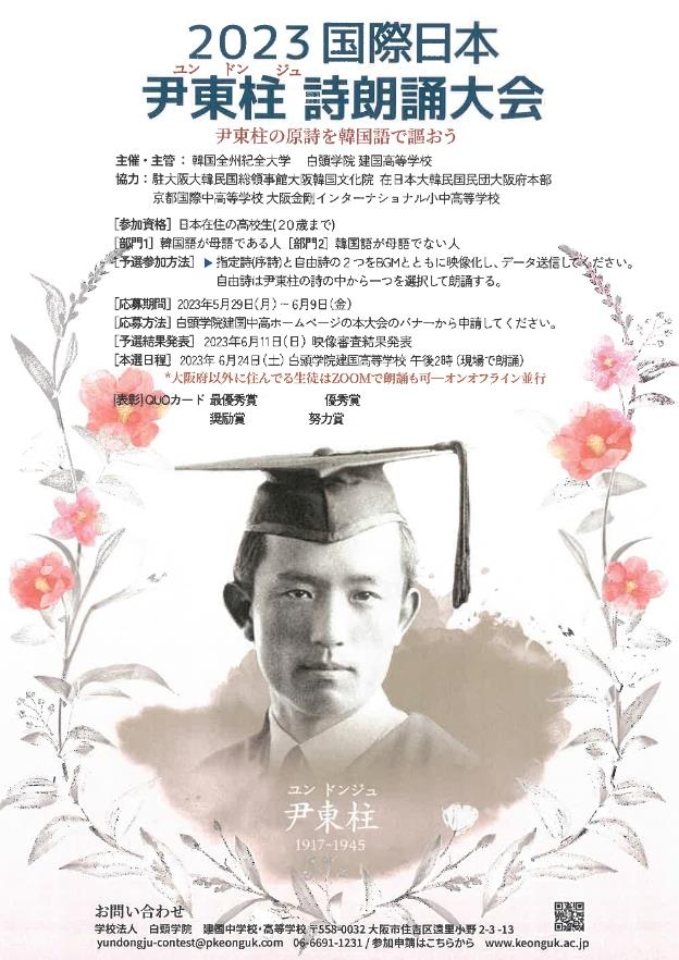 (서울=연합뉴스) 강성철 기자 = 재일동포 민족학교인 오사카 백두학원 건국고등학교는 '2023 국제 일본 윤동주 시 낭독대회'를 개최한다고 30일 밝혔다.