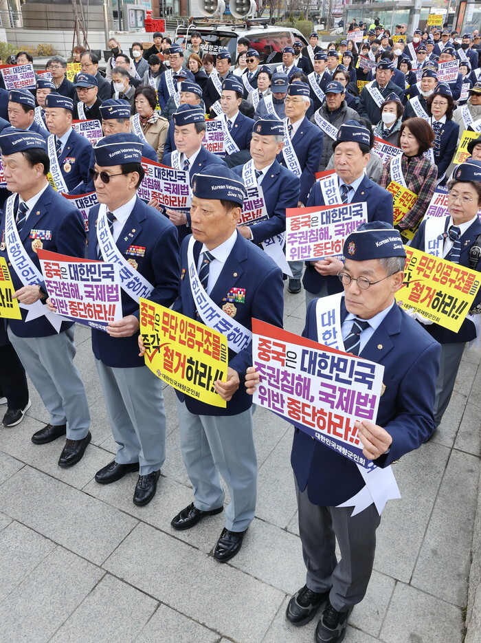 Members of the Korean Veterans Association hold a rally near the Chinese Embassy in Seoul on March 31, 2025, to denounce China's installation of steel structures in an overlapping maritime zone between the two countries in the Yellow Sea. (Yonhap)