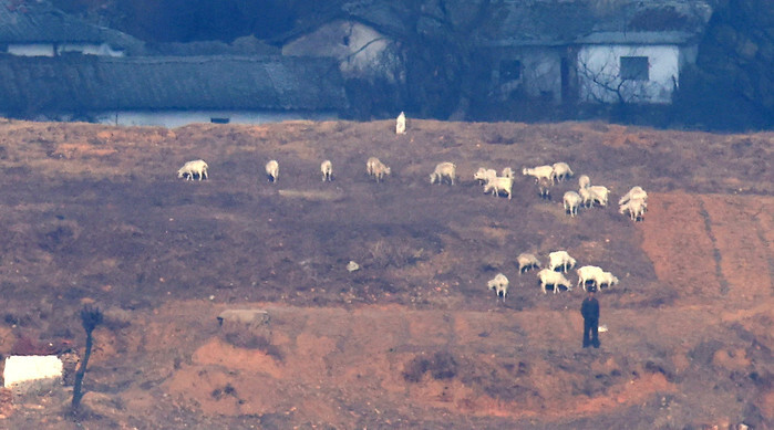 A North Korean resident stands alongside a herd of goats in the border county of Kaepung in this photo captured from South Korea's Ganghwa Peace Observatory in the western county of Ganghwa on Jan. 10, 2026. (Yonhap)