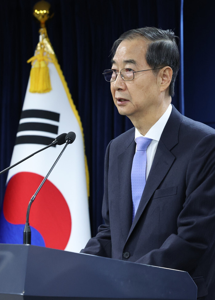 Acting President Han Duck-soo, who concurrently serves as prime minister, delivers an address to the public at the government complex in Seoul on March 24, 2025, following the Constitutional Court's dismissal of his impeachment that reinstated him as acting president in the ongoing turmoil over suspended President Yoon Suk Yeol's brief imposition of martial law. (Pool photo) (Yonhap)