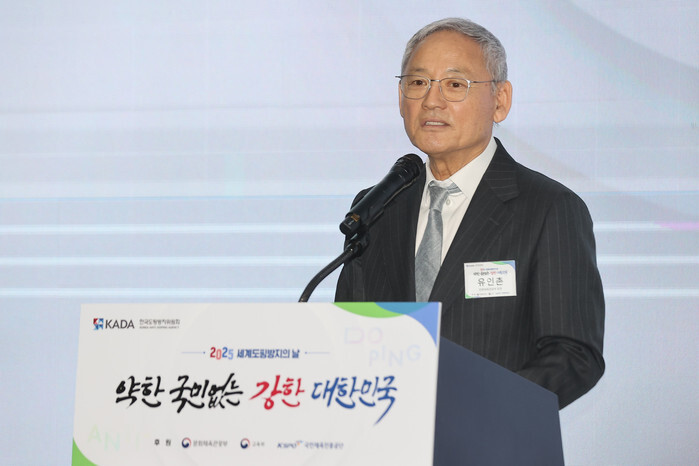 Culture, Sports and Tourism Minister Yu In-chon speaks during a ceremony at Olympic Parktel in Seoul on April 11, 2025, to celebrate the World Anti-Doping Agency's annual Play True Day that aims to promote clean sport. (Yonhap)