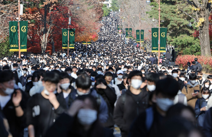 A throng of test-takers leaves the campus of Sungkyunkwan University in Seoul on Nov. 20, 2022, after taking the school's essay test as part of a procedure to gain admission to the university. (Yonhap)