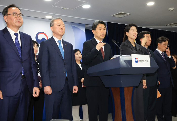 Education Minister Lee Ju-ho (3rd from L) attends a press conference at the government complex in Seoul on April 17, 2025, to announce the government's decision to return the nation's medical school enrollment quota for 2026 to the former level of 3,058 from two years ago, in a bid to resolve a 14-month standoff with trainee doctors and medical students. (Yonhap)