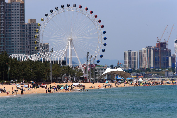 A beach in the eastern coastal city of Sokcho is crowded with people on May 29, 2022. (Yonhap)