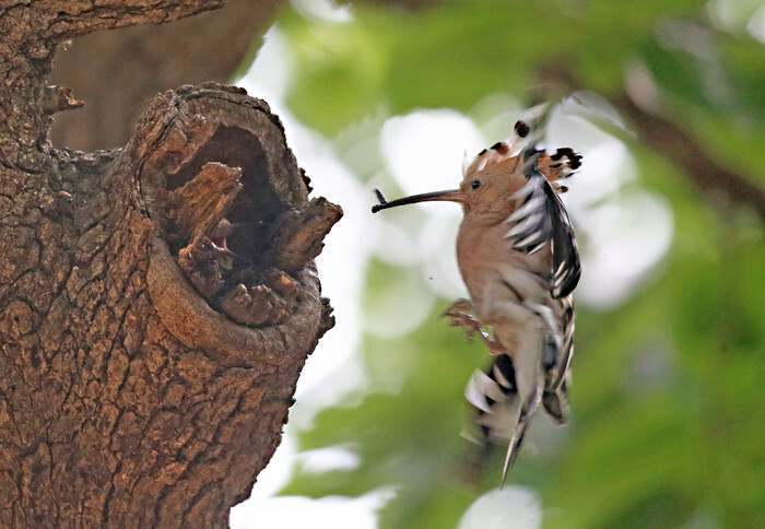 A hoopoe, distinguished by its bold stripes and long, curved beak, feeds its chick in a hole of a tree at a park in the southeastern city of Gyeongju on May 4, 2021. (Yonhap)