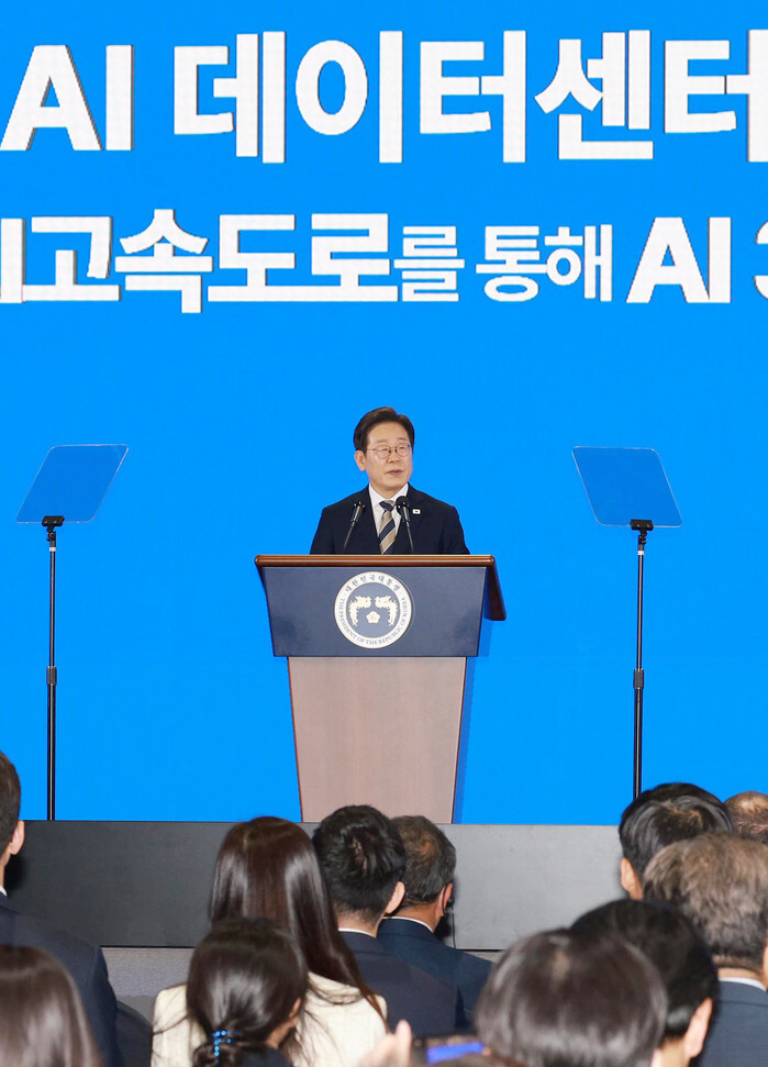 President Lee Jae Myung speaks during a ceremony at the Exhibition and Convention Center in the southeastern industrial city of Ulsan on June 20, 2025, to launch a project to build an artificial intelligence (AI) data center to be jointly built by SK Group and Amazon Web Services. Lee vowed to provide full-scale support for the AI industry, aiming to position it as South Korea's next major economic growth driver. (Pool photo) (Yonhap)
