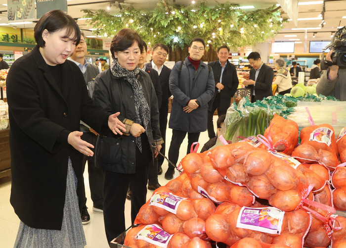 Agriculture Minister Song Mi-ryung (2nd from L) inspects the prices of agricultural products at a retail outlet in Seoul on Feb. 29, 2024, as they continue to rise. (Yonhap)