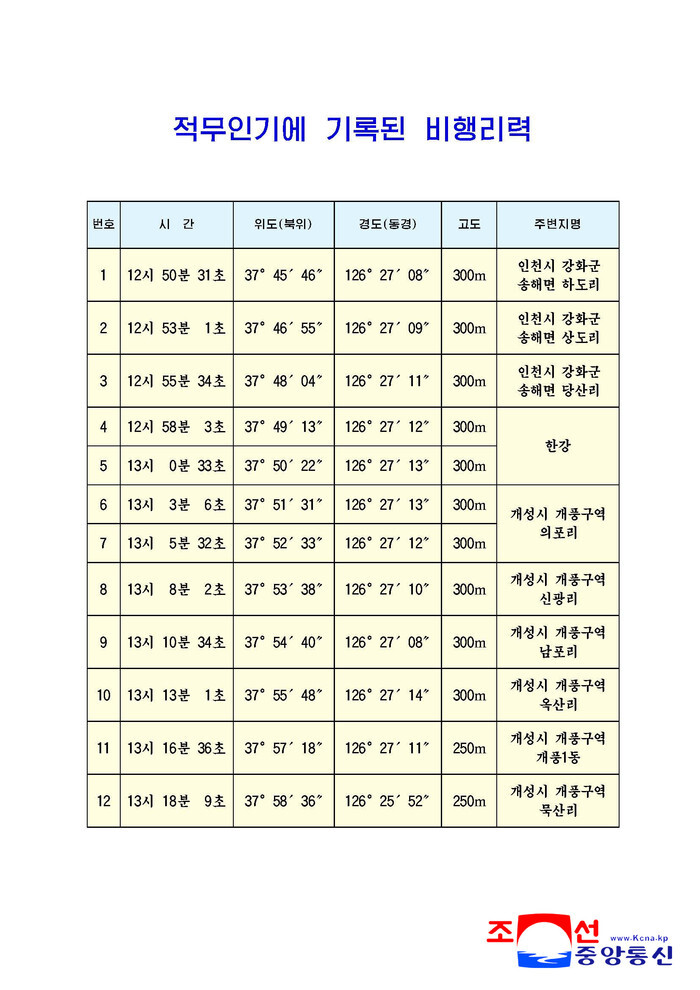 This image, carried by North Korea's official Korean Central News Agency on Jan. 10, 2026, shows the flight records of a purported South Korean drone that Pyongyang claims crossed the inter-Korean border. (For Use Only in the Republic of Korea. No Redistribution) (Yonhap)
