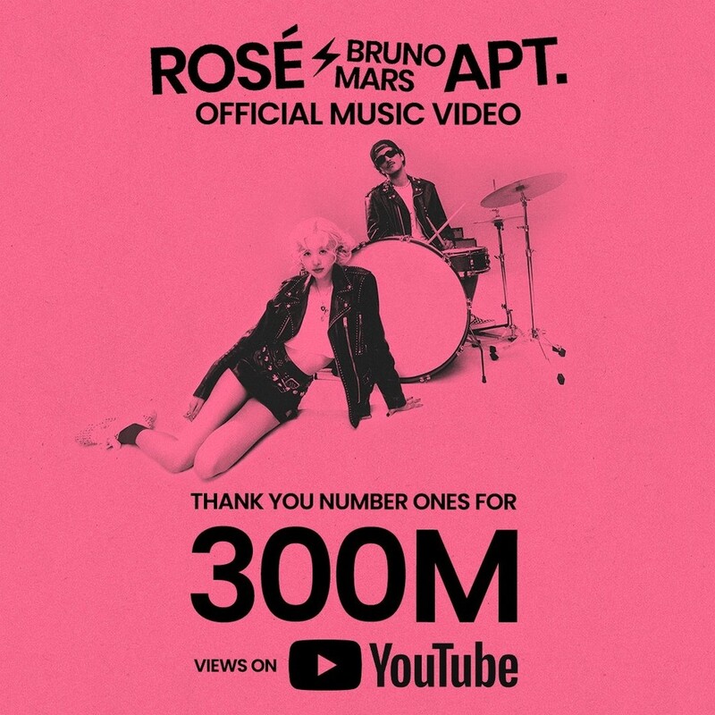 (서울=연합뉴스) 이태수 기자 = 걸그룹 블랙핑크의 로제가 팝스타 브루노 마스와 듀엣한 '아파트'(APT.) 뮤직비디오 유튜브 조회 수가 3억건을 돌파했다고 소속사 더블랙레이블이 12일 밝혔다.