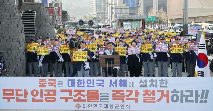 Members of the Korean Veterans Association hold a rally near the Chinese Embassy in Seoul on March 31, 2025, to denounce China's installation of steel structures in an overlapping maritime zone between the two countries in the Yellow Sea. (Yonhap)