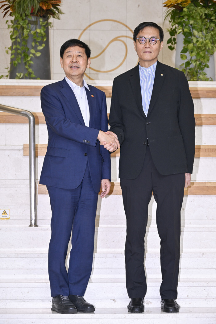 Finance Minister Koo Yun-cheol (L), who serves concurrently as the deputy prime minister for economic affairs, poses for a photo with Bank of Korea Gov. Rhee Chang-yong during their meeting at the central bank's headquarters in Seoul on Aug. 7, 2025. (Pool photo) (Yonhap)
