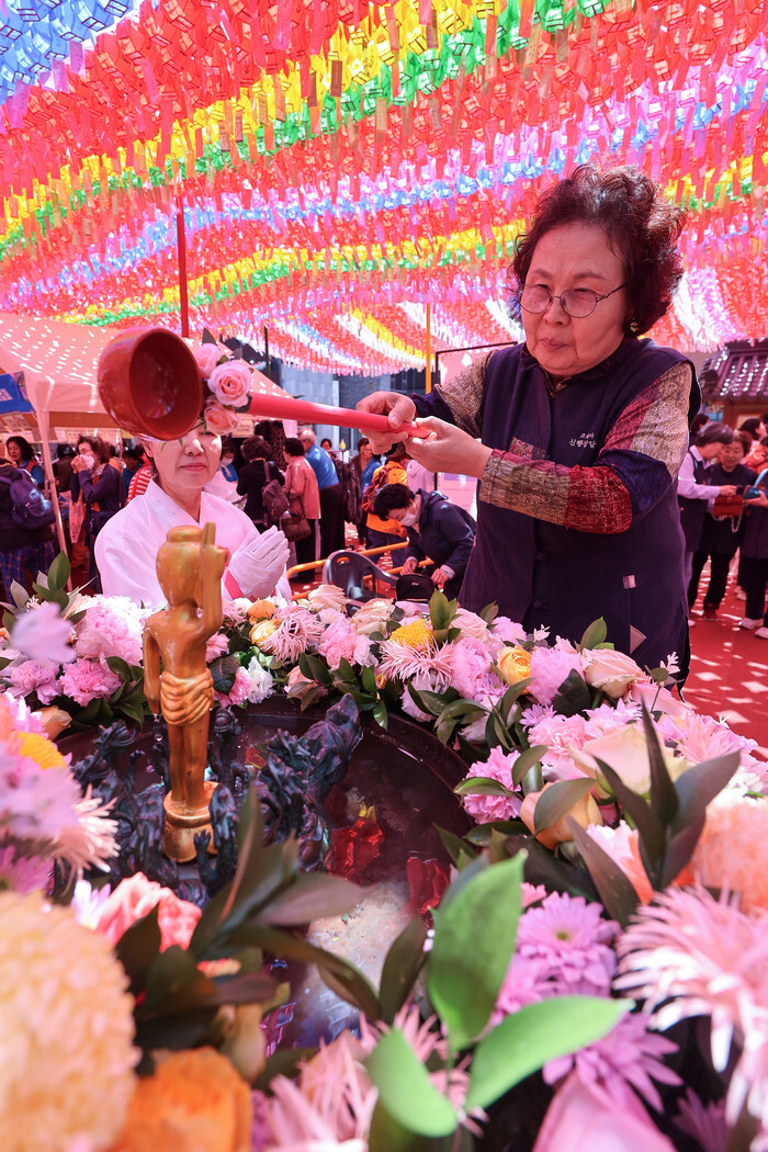 A woman performs the ritual of bathing a statue of baby Buddha at Jogye Temple in Seoul on April 28, 2025, ahead of Buddha's Birthday that falls on May 5 this year. (Yonhap)